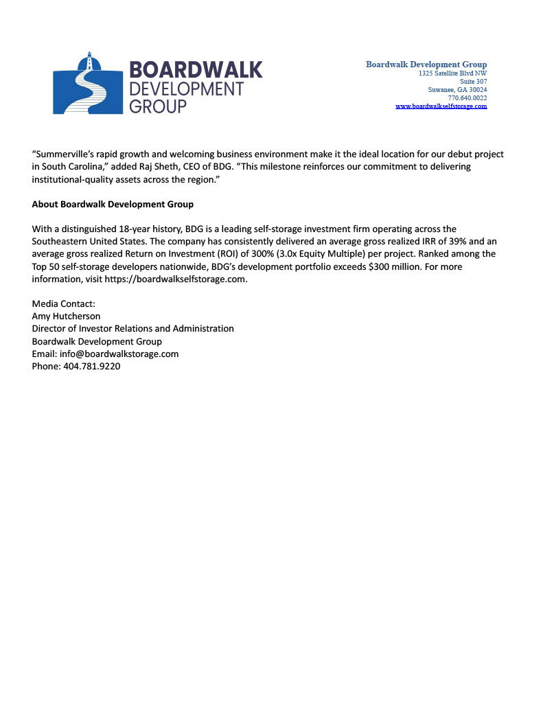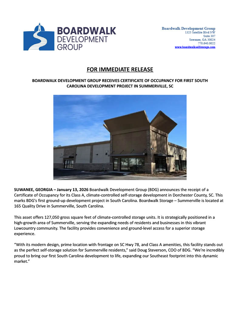 Boardwalk Development Group Receives Certificate of Occupancy for First South Carolina Development Project in Summerville, SC